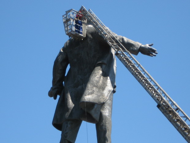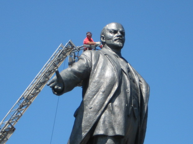 Сегодня работники приступили и к самому памятнику. «Чистка» вождя началась с головы, вернее, с затылочной ее части. Сначала высотник тщательно вымыл голову Ильича, а затем очистил ее от пятен специальной машинки для удаления ржавчины.