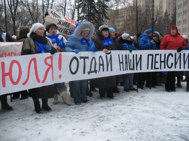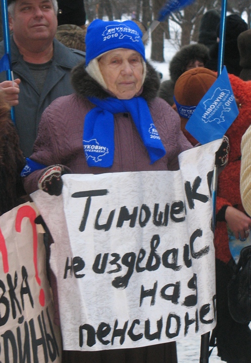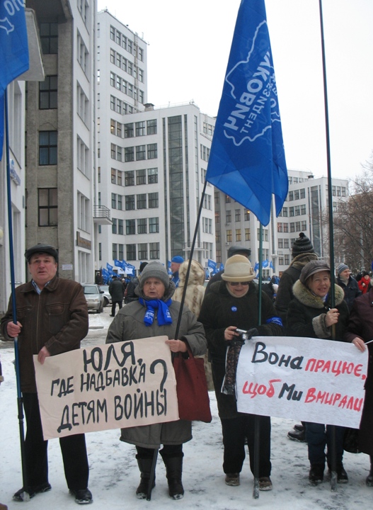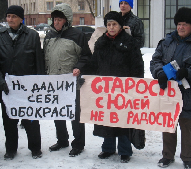 «Тимошенко, не издевайся над пенсионерами», «ВОНА працюе, щоб ми вмирали», «Старость с Юлей не в радость» – такие плакаты в руках у тех, кто, по словам активистов митинга, «всю жизнь проработал на благо своей страны, а теперь выброшен правительством на обочину жизни».