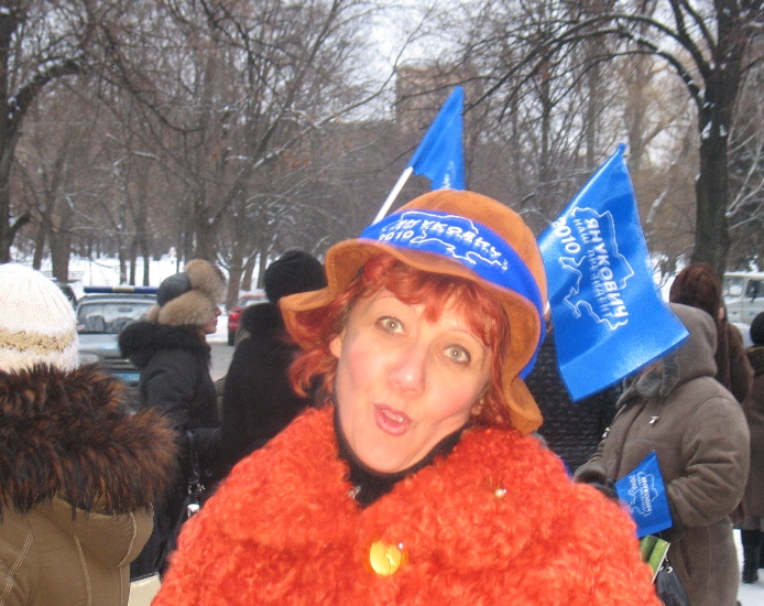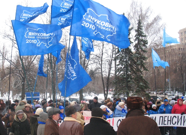 Вдохновившись приездом в Харьков лидера ПР Виктора Януковича, десятки пенсионеров собрались у здания Госпрома, у входа в Харьковское областное управление пенсионного фонда под бело-голубыми флагами.