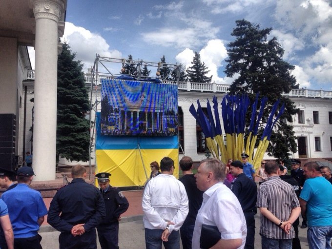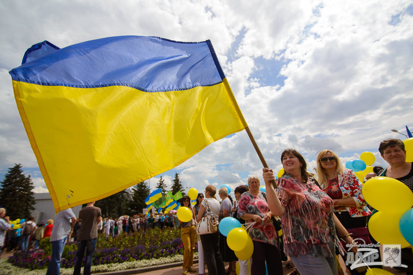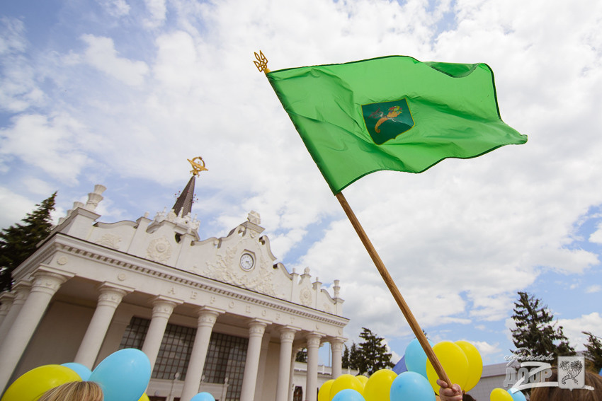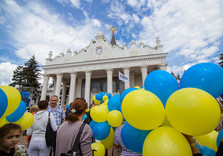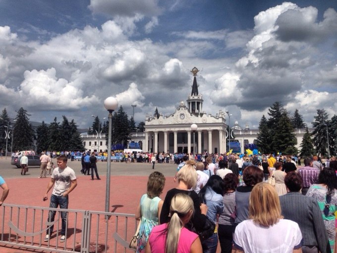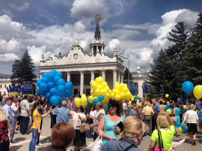 Люди держат в руках воздушные шары цветов национального флага, плакаты: «Кернес – опора Харьковщины», «Кернес – стабильность и порядок», «Кернес, Харків, Україна», «Кернес – Единая Украина», «Харківщина с Кернесом».
