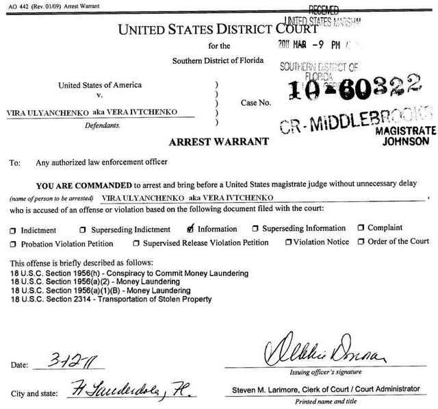 12 марта 2011 года Окружной суд Флориды (США) выдал ордер на арест близкой соратницы экс-президента Виктора Ющенко Веры Ульянченко.